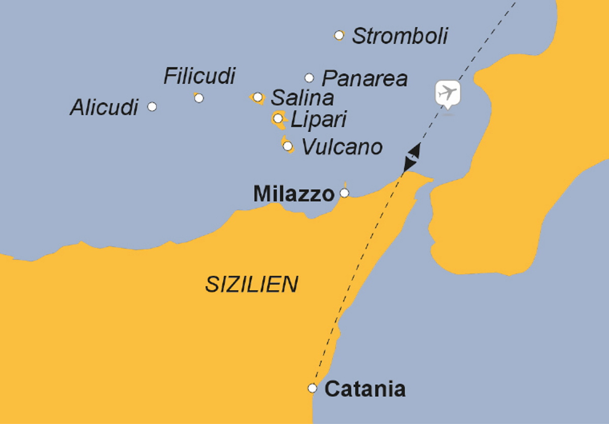- Ausflüge: Lipari mit Lipari-Stadt & Inselrundfahrt, Salina mit Santa Marina und Weingut, Alicudi mit Filicudi & mit Spaziergang zum Capo Graziano, Panarea mit Mittagessen, Stromboli mit Inselrundfahrt, Vulcano mit Hafenrundgang & Wandermöglichkeit zum Kraterrand