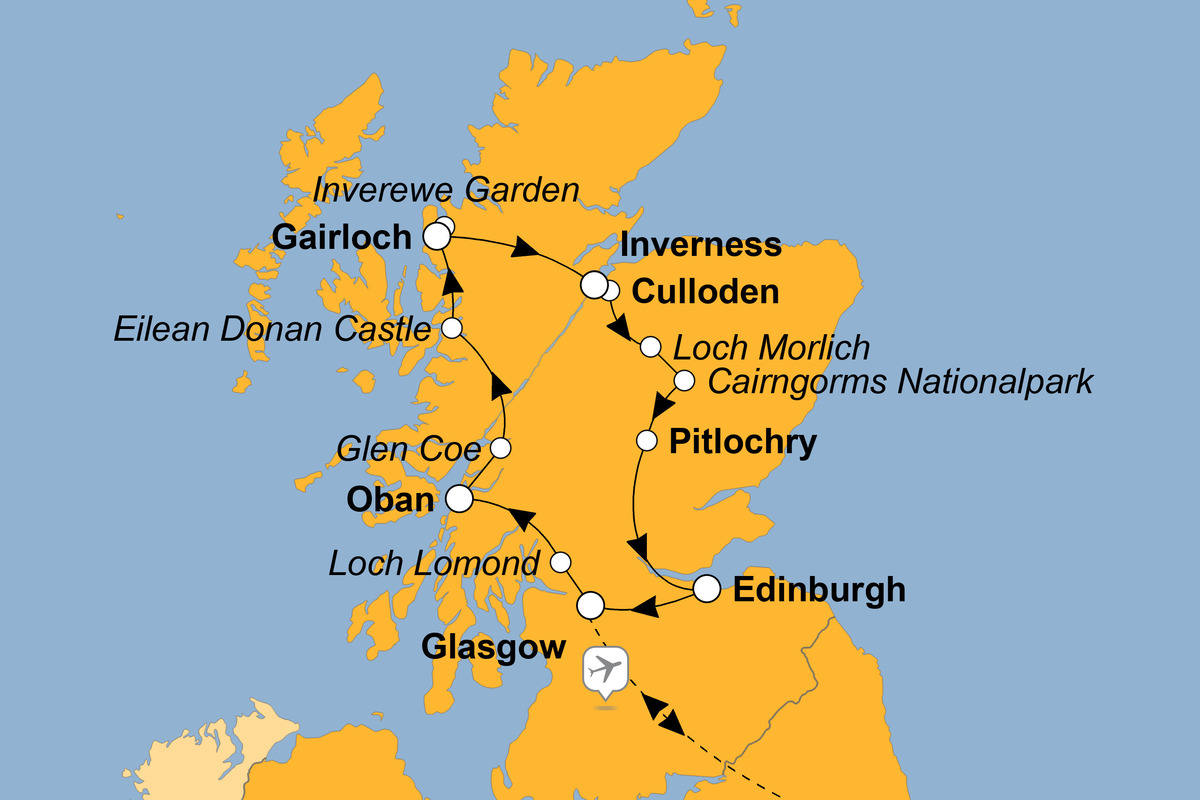 Ein Transfer bringt Sie zum Flughafen nach Glasgow/Edinburgh, von wo Sie heute zurück nach Deutschland fliegen.